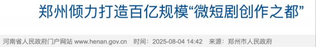 起因或源自前不久出台的《郑州市打造"微短剧创作之都"工作实施方案(2025 — 2027 年)》,提出了一个雄心勃勃的目标:着力打造"微短剧创作之都"。