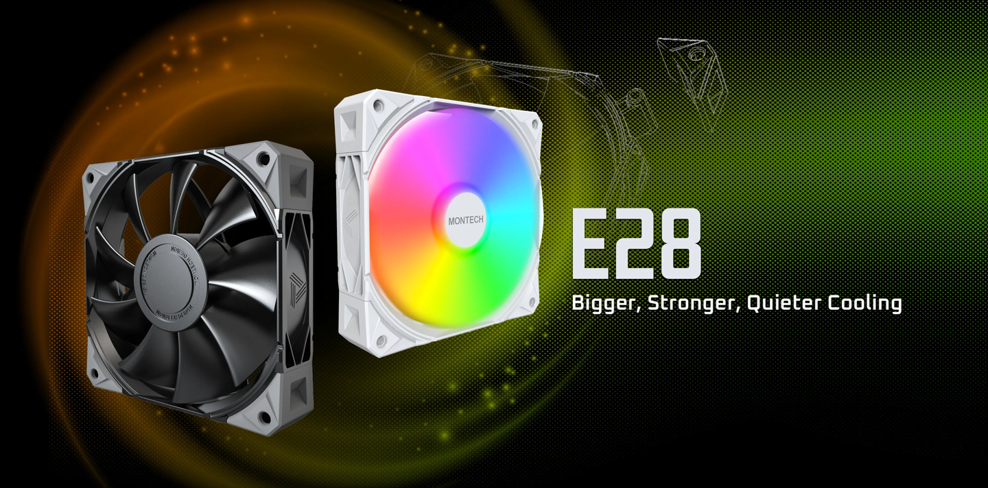MONTECH 还一并发布了 E28 风扇的一般版本启远网 ,最大转速降至 2000 RPM,最大风量 85.09 CFM、最大风压 3.35 mmH2O、最大噪声 34.17 dB(A),可选黑 / 白两种配色、有 / 无 ARGB,以单颗或三入包形式提供。