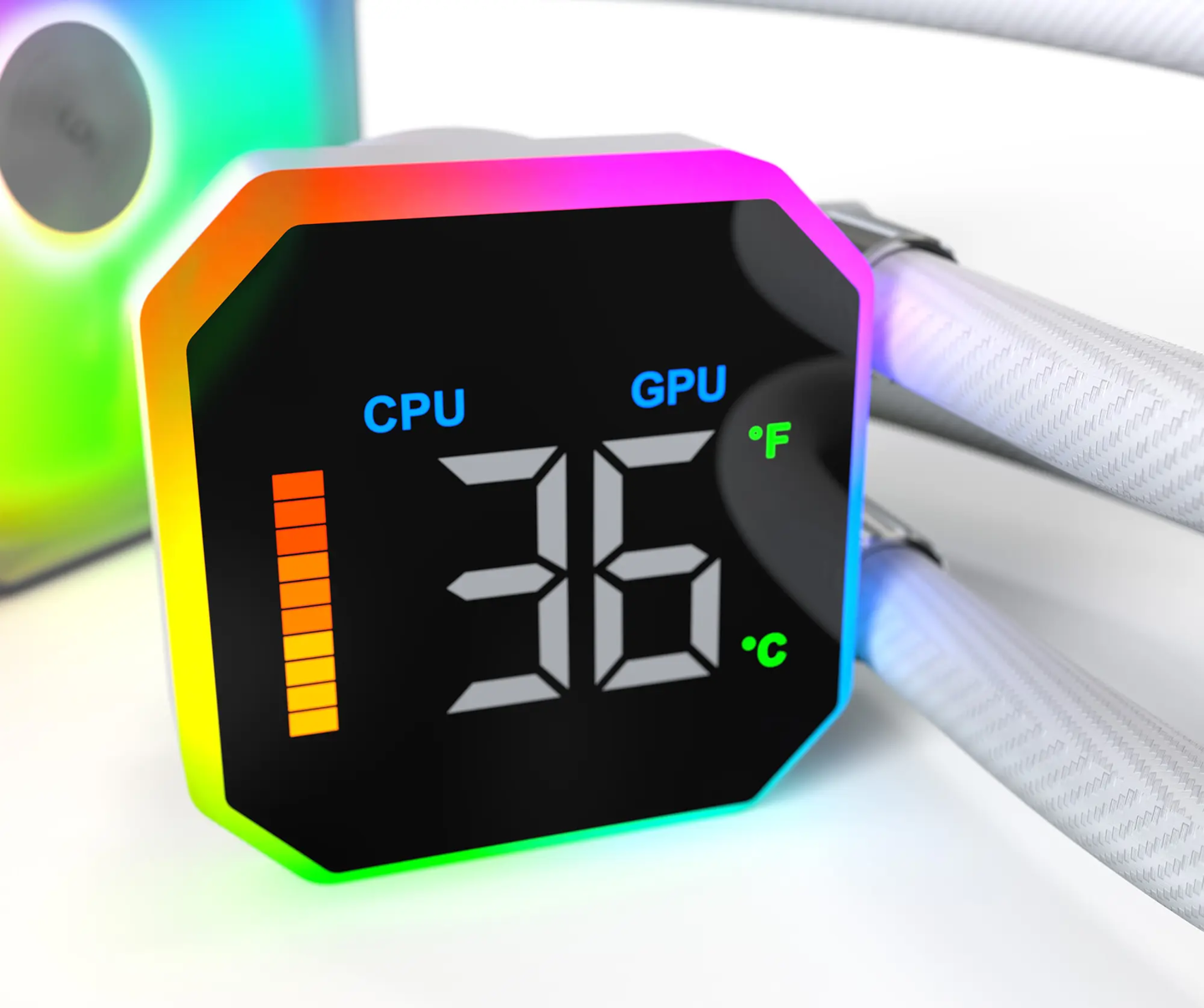 HyperFlow Digital 系列水冷搭载 3100RPM 高性能水泵,配备 400mm 长度水冷管、 27mm 标准厚度的 20FPI 高鳍片密度铝制冷排,配备 12028 尺寸的 FDB 轴承风扇 E28 ARGB。